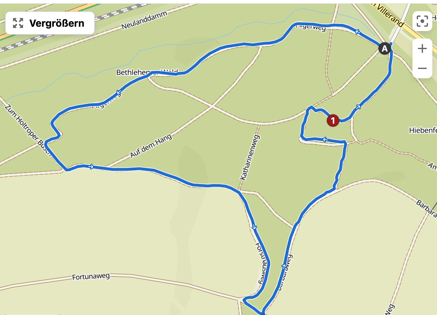 - In gleicher Marschrichtung gehen wir nun wieder runter, stoßen auf den spitz von rechts kommendem Weg „Zur Bethlehemer Höhe“ und folgen diesem geradeaus abwärts, bis wir wieder den Wanderparklatz „Am Villerand“ erblicken