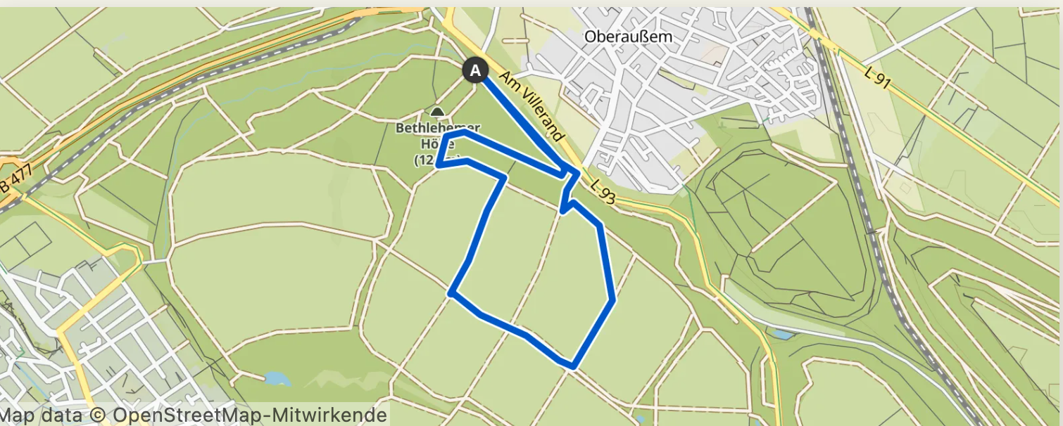 - Start und Ziel ist der Wanderparkplatz „Am Villerand“ südlich von Niederaußem an der Verbindungsstraße von der B 477 nach Quadrath