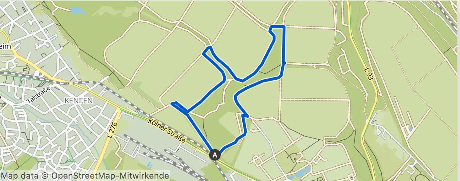 - Start und Ziel ist der Wanderparkplatz „Am Martinswerk“ an der Straße von Kenten nach Quadrath, direkt links hinter der Bahnbrücke am Martinswerk